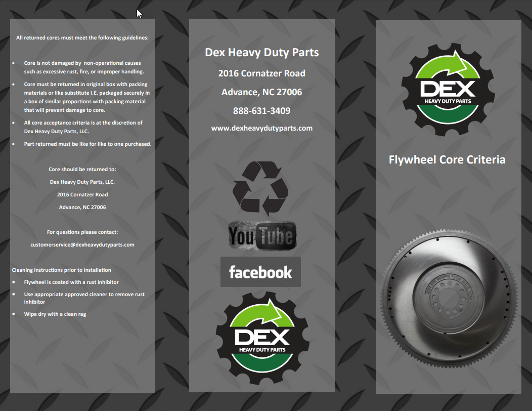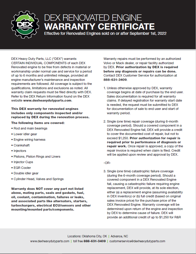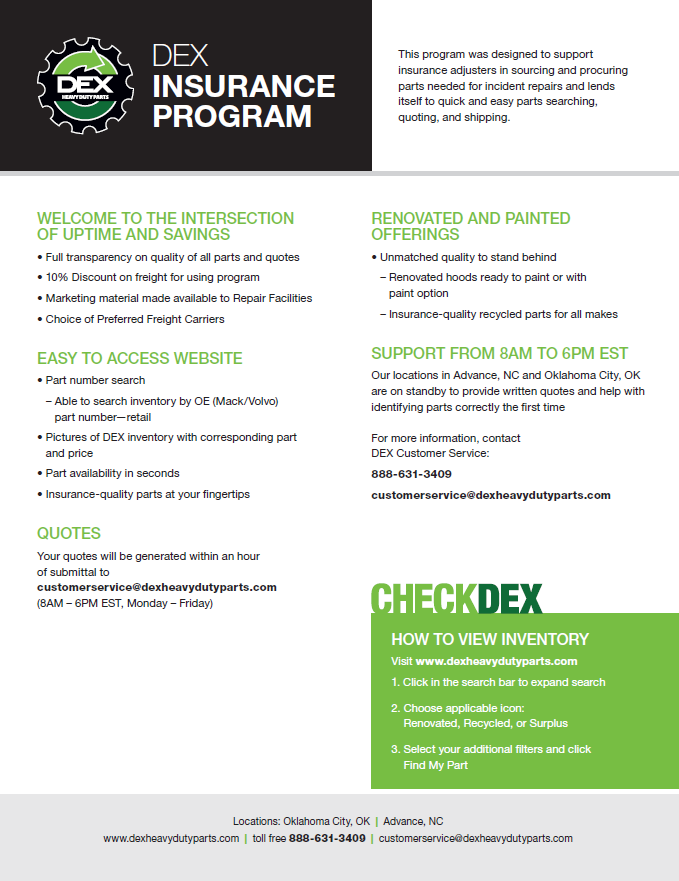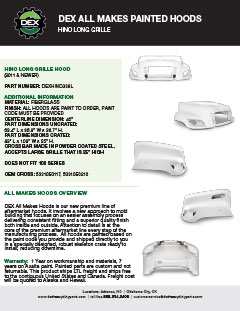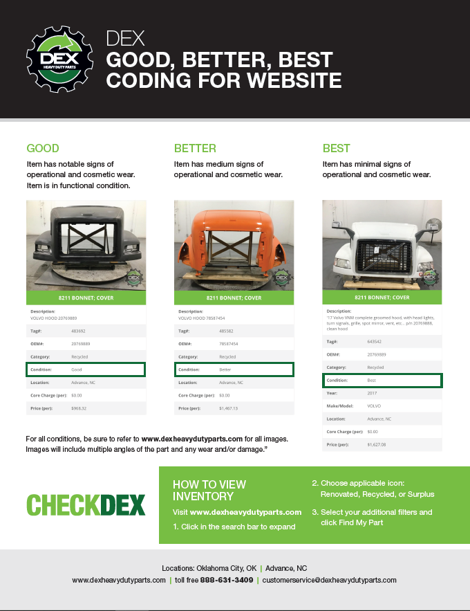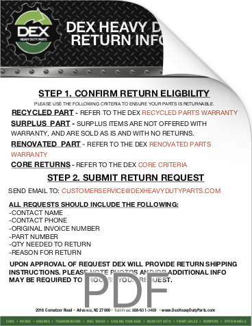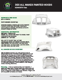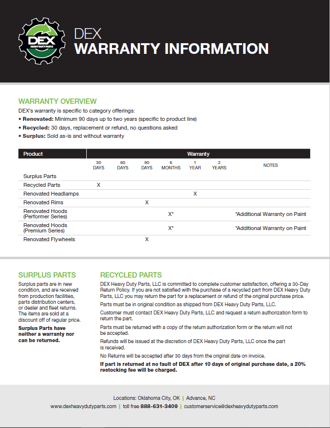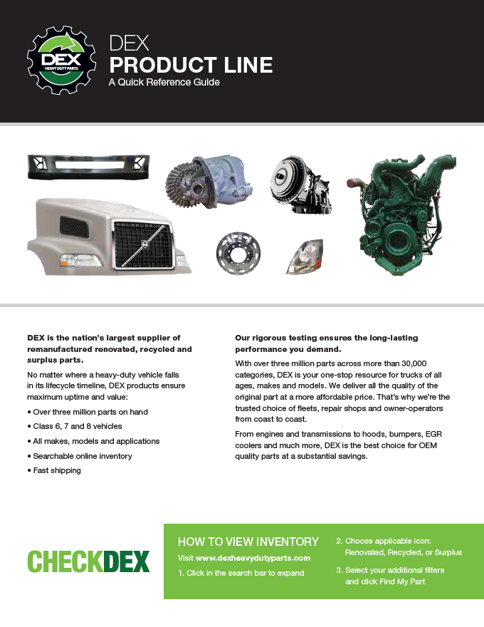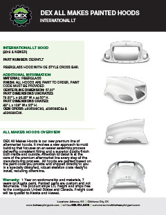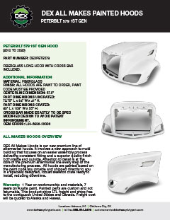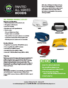 Downloads General Documents Visitor Guide - North Carolina Facility Visitor Guide - Oklahoma City Facility Good Better Best Website Descriptions Flywheel Core Guide Insurance Program & Repair Shop Sign Up Form Product Sheet - Surplus Parts Quick Reference Guide - Product Lines DEX AMT Brochure with Tags Painted All Makes Hoods All Makes Hoods Overview Freightliner Hoods Hino Hoods International Hoods Kenworth Hoods Peterbilt Hoods Warranty Info DEX Return Information Warranty - Information Manual Warranty - Renovated Engine - Sold After Sept 1st 2022
