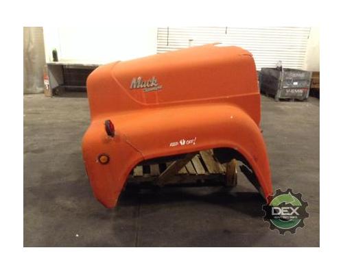 '82 Mack R model hood assembly, has gouges in RH front, cracked on LH fender at cowl and mudflap, broke at crossbar under grille opening. Best used for parts.