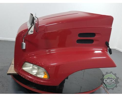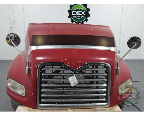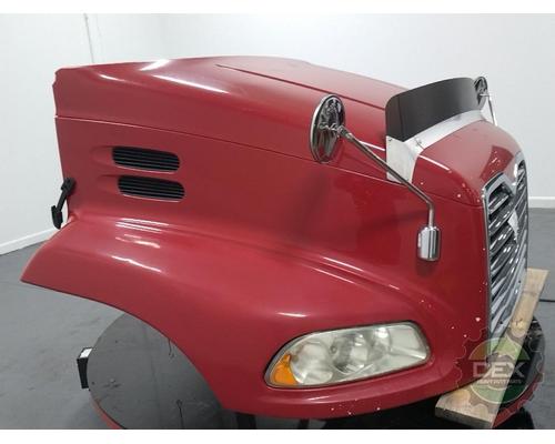 '12 Mack CXU axle back complete groomed hood assembly, with headlights, grille(cracked), latches, vents, spot mirrors, bug shield, etc... rock chips in paint, otherwise good solid hood, Painted Mack Red 75500PP